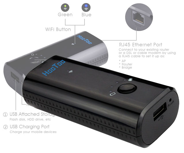 [All-in-1] HooToo® TripMate Wireless N Portable Travel Router (5200mAh Power Bank, USB Storage Wi-Fi Media Sharing, Access Point, Wi-Fi Mini Router & Bridge)