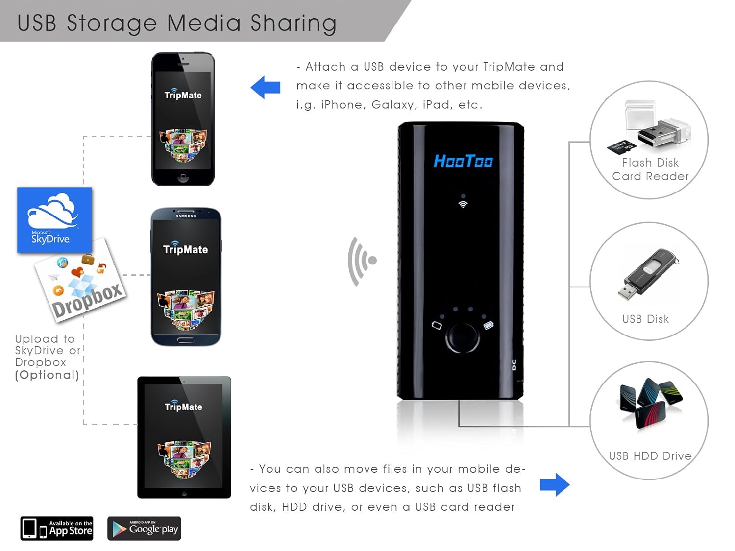 - Personal Cloud: Sharing files or streaming movies in attached USB storage devices via self-generated Wi-Fi
