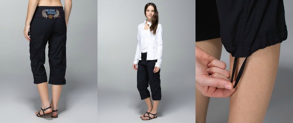 I wanted to blog these pants because I have a pair of these, except they are not the cropped style and they are amazing. Everyone I know that has the studio pants loves them. They are the perfect pant for going from here to there and you can easily throw them over top of shorts and your other yoga gear. You know how sometimes your other Lulu pants are a bit too fitted in the butt and other areas to go grocery shopping, but fine for yoga? Well, these are the perfect solution for putting on right over your tighter pants without having to get fully changed. You can also wear them alone, which I often do and they are perfect, even on really hot days because the fabric is so lightweight.