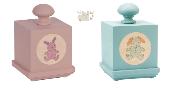 This is an adorable little wooden music box decorated with a vintage, stuffed toy. The blue box features a puppy and the pink box features a rabbit. Both the blue and the pink music boxes will play the classic melody of Twinkle, Twinkle Little Star to lull your little one to sleep. The music box measures 4″ by 4″ x 6″ and will fit easily on a side table beside your child’s crib or bed.