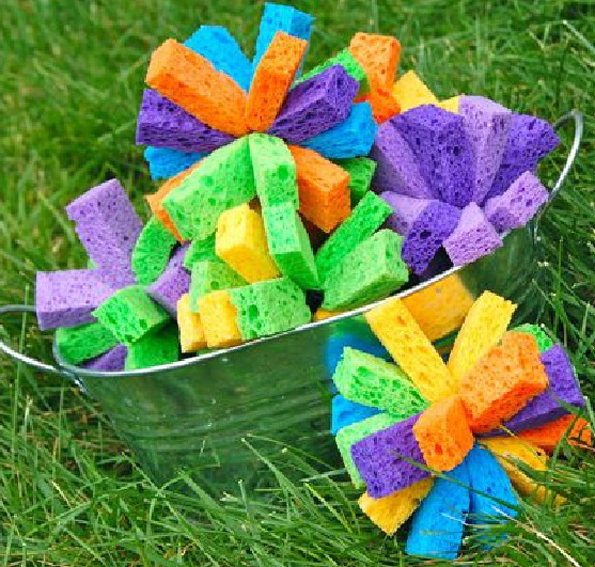 I spotted this little craft on Pinterest and I just had to share with you guys. Make your own sponge bombs! Simply grab some cheap sponges from the dollar store or Walmart, cut them into thirds then secure them together with hair elastic. The final product looks like the image above.