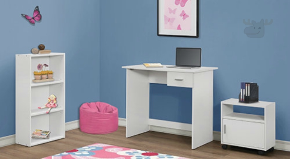 This furniture set includes a three-shelf bookcase with two adjustable shelves, a writing desk with a storage drawer, and a multi-purpose cart. This set is perfect for small rooms and small apartments where space is at a premium. You have everything you need in these three pieces – except a chair.