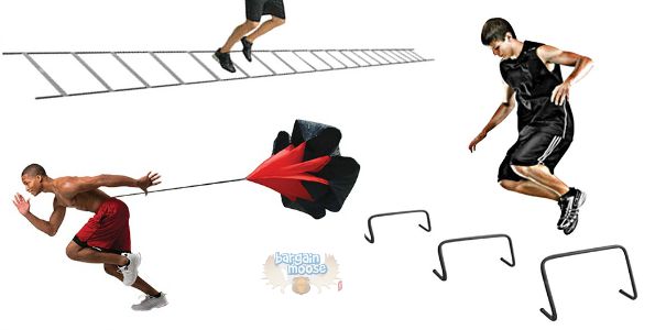 I found this exact kit at Costco.ca for $84.95. Sears.ca also carries this exact fitness kit for $99.99. Over at Amazon.ca, I found a similar agility kit that does not include the resistance chute for $99.99. Priced out individually on Amazon.ca, a similar Sklz brand parachute runs $29.99 and a Sklz ladder costs $38.16 before you add the hurdles.