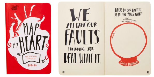 So what IS this thing? Well, Map My Heart lets you doodle your way to the darkest depths of your heart. It makes you think about yourself, where you see yourself, and how you relate to the world. It will also make you laugh and draw and have a lot of fun all packed into one interactive little book for $5. As one description says: