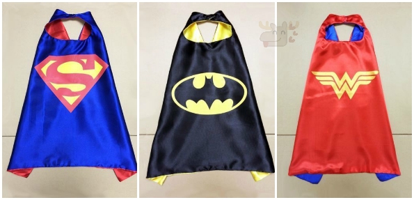 There are so many different capes for girls and boys to choose. Batman and superman are sure to be fan favourites, but Captain America, Spider-man, Robin, and others may just catch your child’s fancy. I like how they have different colour schemes as well… primarily for the Batman and the Superman capes. My favourite cape is for Wonder Woman. Not that she actually ever had a cape, but I like it because I have a Wonder Woman swimsuit that would match it perfectly.