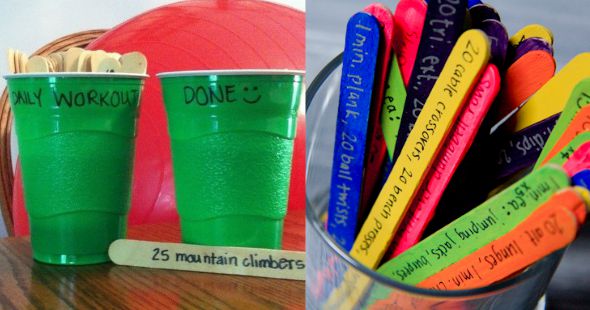You can write different exercises on each popsicle stick. My best suggestion is that you colour code the exercises for each area of your body that you are working on. You can even find the multi colour craft sticks at most dollar stores and then just use a black Sharpie. Then you can label your two cups. Write “Get Off Your Butt” on one cup, and “Done” on the other. Place all of the popsicle sticks with writing in one of the Solo cups marked “Get Off Your Butt” or something motivational along those lines. Make it a a task to tackle 5 popsicle stick exercises each day. Once you have used all of the popsicle sticks from one cup, dump them all back from the Done cup into the Get Off Your Butt cup.