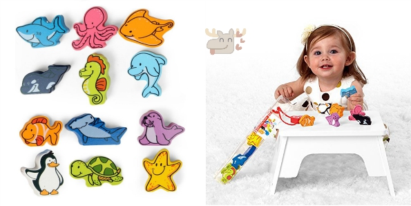 This set includes twelve aquatic-loving creatures with a convenient tote. Your child can practice colours, numbers, and names when they play with these toys. I originally thought that these were toys for playing with in the tub, but they are actually wood-based toy creatures that your child can enjoy anywhere. They are designed for ages 12 months old to three years.