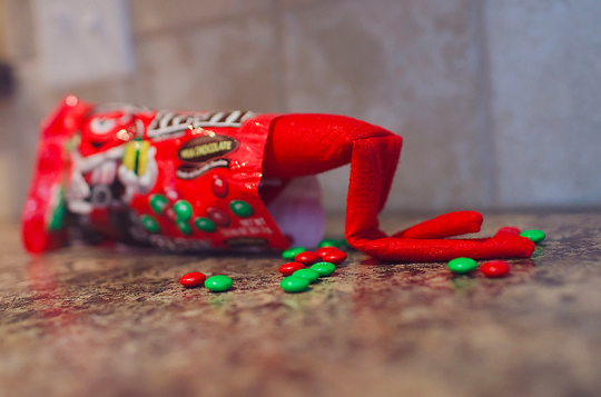 Elves love candy. So stage your elf to look like he snuck into a bag of M&M’s or some other delicious treat that the kids will enjoy too.