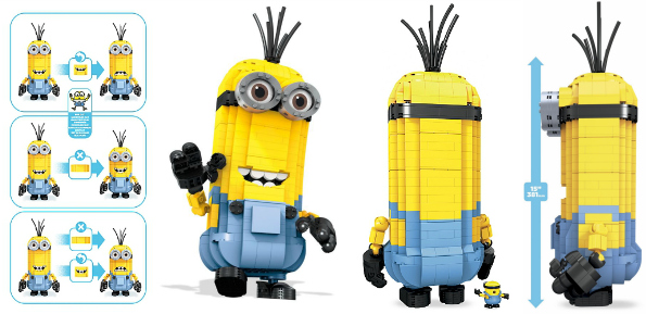 We are talking the COOLEST toy ever! Mega Bloks has teamed up with Minions to offer every kid and kid at heart what they really want: an amazing Minions building block set. This 776-piece set will give you hours of fun building and customizing your Minion Kevin. This guy stands over a foot tall (15″) and can be customized. Make him shorter or taller. Make him smile or frown. Change his pose. You can even have the pocket on his overalls closed or open. There are many ways to customize Kevin when you build him. Then, you can tear him down and build him all over again a different way.