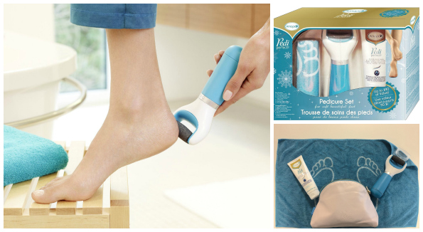 This set includes the Amope Pedi Perfect Pedicure Electronic Foot File with one course roller head, one extra rich skin recovery foot cream (120ml), one pedicure beauty bag, and one microfiber towel. The foot file alone costs $39.99 @ Amazon or $44.97 @ Walmart when purchased separately, so this bundle is well worth the price. I found the same Amope Holiday Gift Set for $64.98 @ Well.ca and $69.09 @ Alliance Plus Pharmacy Canada.