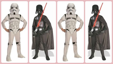 These costumes will fit any child who wears size 4-6. The Darth Vader costume includes the jumpsuit, belt, cape and a mask while the Stormtrooper costume includes the jumpsuit, shoe covers and the mask. I think it might be worth it to buy both costumes for the kids, no?